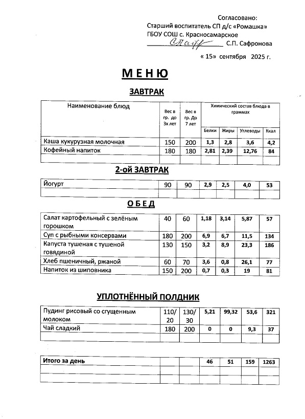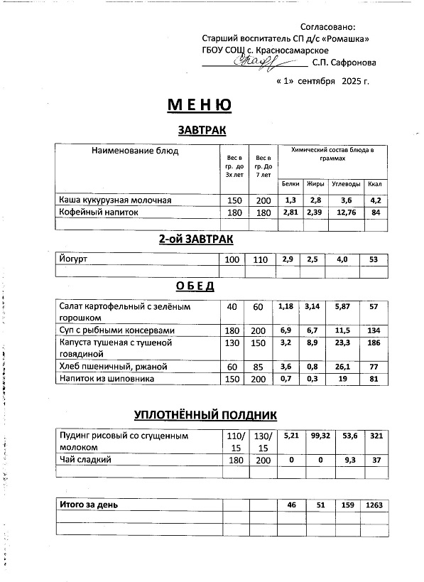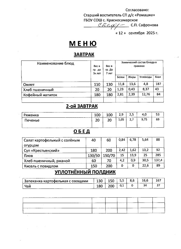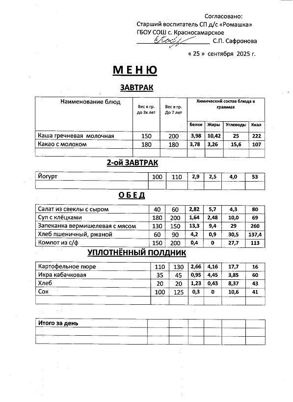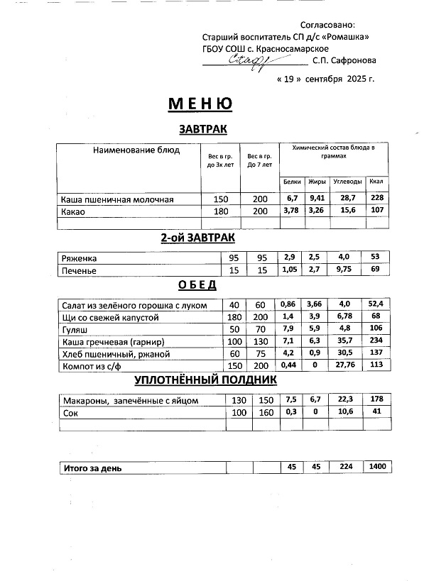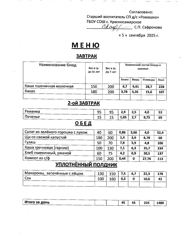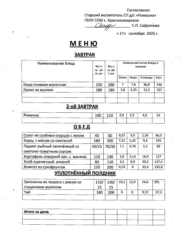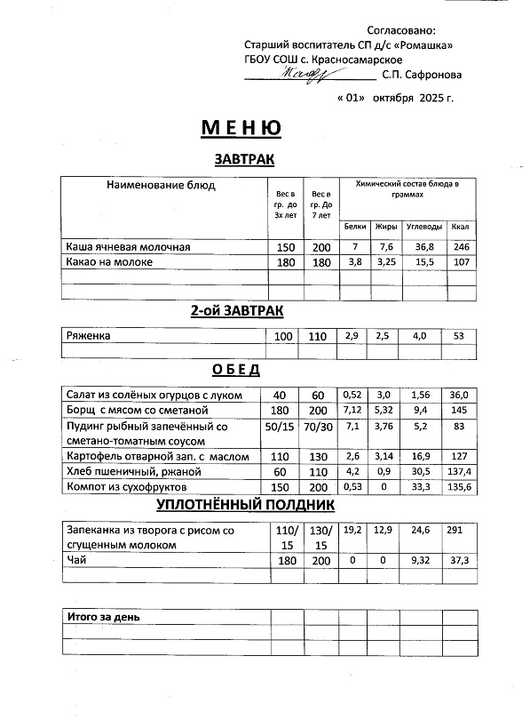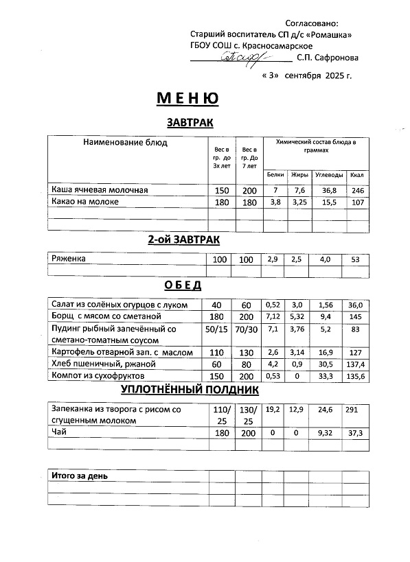Приготовление пищи осуществляется в СП детский сад «Ромашка» ГБОУ СОШ с. Красносамарское.